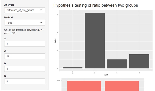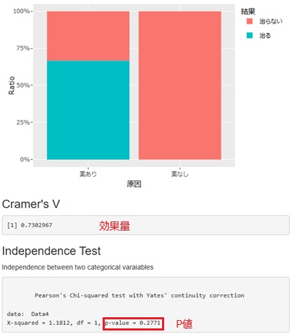 グラフ、比率の差(因果効果)、比率の比(効果量)、P値が出力されます。