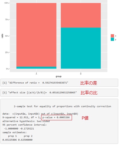 このP値は、独立性の検定のものですが、数学的には、比率の差の検定と同じことをしています。
