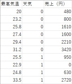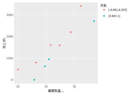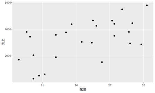 気温と売上の関係だけを見ると、気温が上がるほど売上が高そうですが、強い関係ではないように見えます。