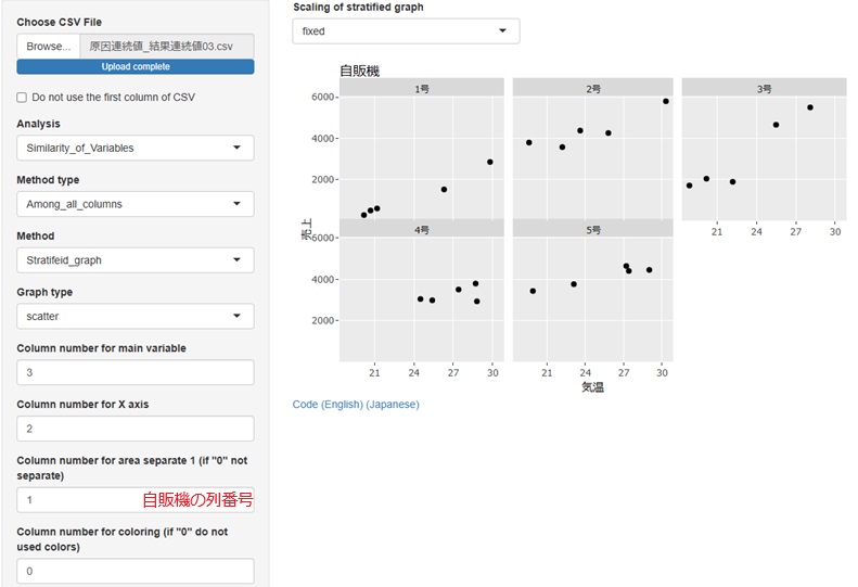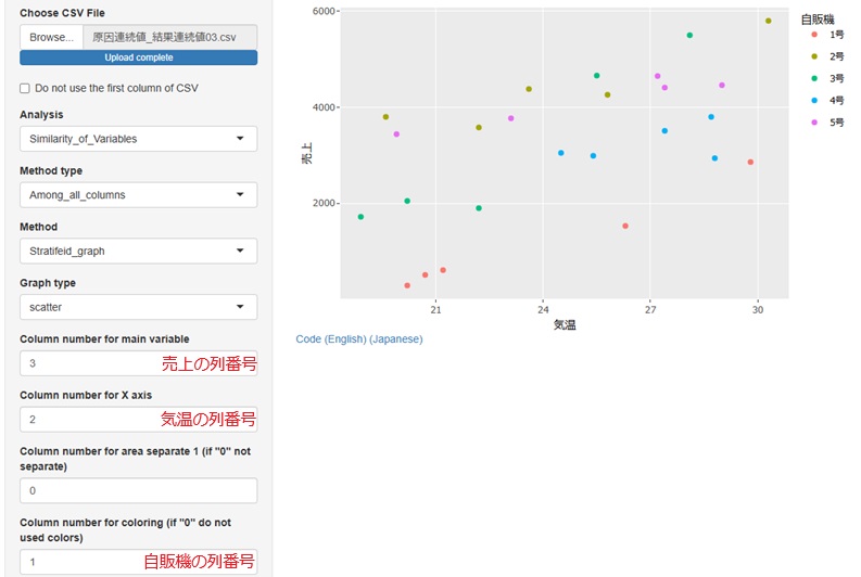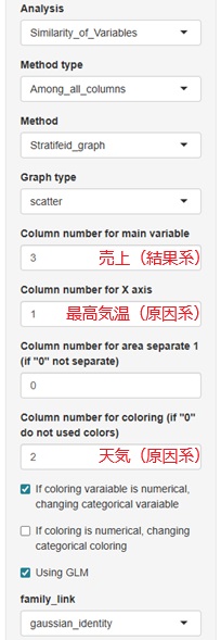 普通の散布図で分析できるのは、原因系が1つの場合ですが、R-EDA1の散布図は、色や分割を使う事で、3つまでは分析できるようにしています。 この散布図と、重回帰分析を組み合わせた分析ができます。